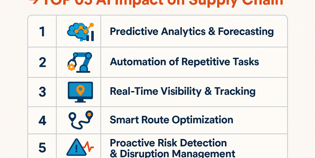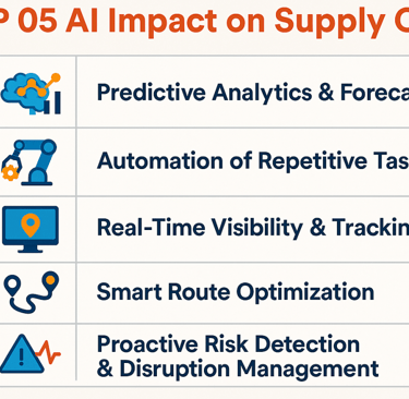5 Proactive Risk Detection & Disruption Management: AI swiftly analyzes global events, flagging supply risks or disruptions and enabling companies to reroute or adapt before problems escalate.